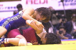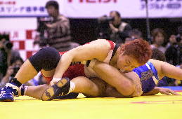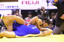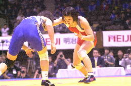 【評】伊調がパッシブを取り、パーテールからまささき攻撃で2+1点。さらにタックルを決めて4点目。第2ピリオドも早々にバックを取りグラウンドでも攻めて7−0、9−0とし、最後にまたさき攻撃。正田が返したが、すでに10ポイント差がついていた。伊調は初優勝。(写真:赤が伊調)