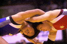 【評】第1ピリオドは伊調が2度パッシブを取るが、ともにポイントにはつなげられない。第2ピリオドのクリンチは伊調が服部を押し倒して2点を獲得。服部が1点を返し、延長へ。クリンチでは服部が手を離してしまい、伊調が決勝の3点目を取った。伊調は初優勝。(写真:赤が伊調)