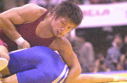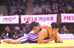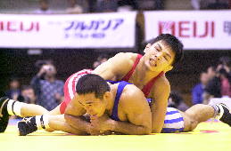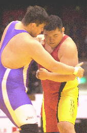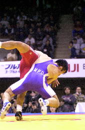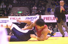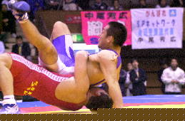 | 決 勝 ○[5-0=6:05]富谷光雄(自衛隊) 【評】笹本がパッシブからローリングで2点を先制。しかし、このあと富谷の攻撃に攻めあぐね、第2ピリオドを終わって2−0で、延長へ。しかし延長のクリンチでは、見事なそり投げを決め、振り切った。笹本は3年連続3度目の優勝。(写真:赤が笹本) |