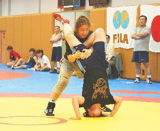 韓国選手相手にアンクルホールドを試す浜口京子(1)