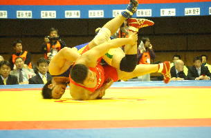 《経過》松本がバックを取り、ローリングを決めて開始1分で3−0へ。太田の首投げを逆に返して3点。このあと、豪快なリフト技を決めて、テクニカルフォールを決めた。(写真は、赤が松本)