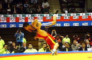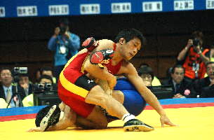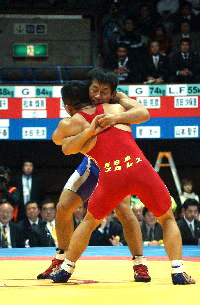 《経過》伊調ががぶってきたところを正田がくぐり抜け、1点を先制。しかし伊調がタックルで1点を取り返す。さらに落としてバックを取り2−1と逆転。第2ピリオドも、落としてバックを取り3−1とした。ラスト40秒、正田がパッシブパッシブからローリングを決め3−3へ追いつく。しかしラスト3秒秒、伊調の片足タックルが決まり、薄氷を踏むような勝利をものにした。(写真は、赤が伊調)
