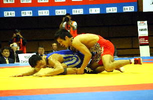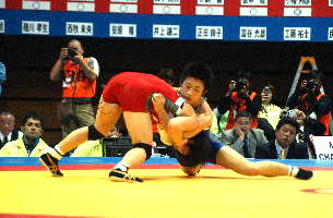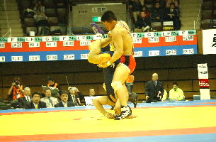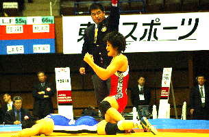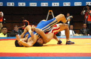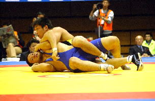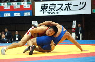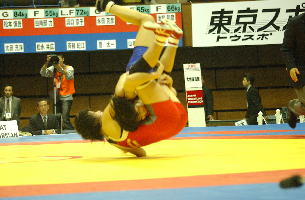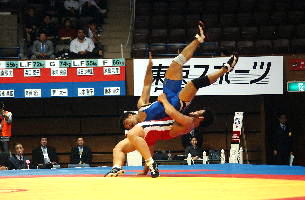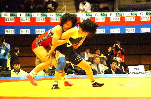 《経過》塚本が1分すぎにタックルで1点を先制。しかし第1ピリオドのラスト20秒、菅原が豪快な3点タックルをきめ、続いてグラウンドで4点を追加。7−1とリードした。第2ピリオドも菅原が2点を追加したが、グラウンド技を失敗。塚本がポイントを加え、5−10と追い上げた。しかし菅原はラスト30秒に1点を追加して振り切った。(写真は、青が菅原)
