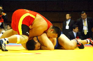 《経過》1分、笹本がパッシブを取り、ローリングで2点。2分20秒にもパッシブを取り、ローリングを決めて4−0とリード。第2ピリオドも笹本がパッシブを取りリフト技狙い。富谷は必死にこらえたが、攻撃することはできず、そのままのスコアで試合終了。(写真は赤が笹本)