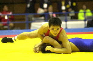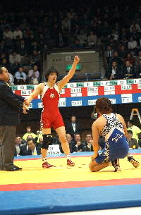 《経過》小幡が開始早々タックルを決め、またさきへ。そのまましつこく攻め、最後はフォール勝ち。規定でアテネ五輪の日本代表を決めた。(写真は、赤が小幡)