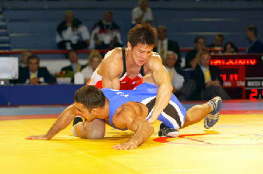 この階級の日本代表の加藤賢三(自衛隊)は、日本選手の中の一番厳しいリーグでした。昨年2位のガベール、さらに同3位のアリ・モロフ(ブルガリア)と同ブロックだったのです。モロフに対してはローリングを2回を回されて0−3。ガベールにはテークダウンとローリングなどで5ポイントを取りましたが、結局5−17のテクニカルフォール負けでした。