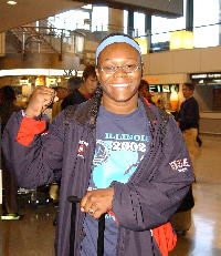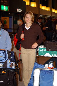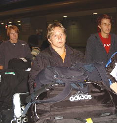 第3回女子ワールドカップ(10月11〜12日、東京・代々木第二体育館)に出場するカナダ、ドイツ、ロシア、中国チームが9日、相次いで成田空港に降り立ったが、約2年2ケ月ぶりに日本の地を踏んだカナダ・チームのエース、世界V6(歴代最高)の72kg級、クリスチン・ノードハーゲン(写真右)は打倒浜口に並々ならぬ意欲を見せ、「絶対に負けない」と気合を入れた。