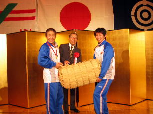 【写真上】勢ぞろいしたワールドカップ日本代表、【写真下】十日町後援会から贈られた必勝祈願米1 俵を持ち上げる浜口京子(