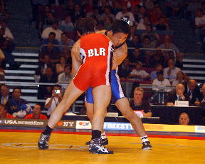 予選を通過した段階で9〜11位を確保。次の試合で勝てば8位以内、負けても内容がよければ10位に入れるという状況でのムラド・ガイダロフ(ベラルシア)戦。先制を許し追う展開となったものの、失点を押さえ1−2で延長へ。スタミナに勝る日本選手の勝ちパターンと思われたが、ラスト1分10秒の段階で力尽きた。「体に何か塗っていた。かかえたと思ったのに滑ってしまった」そうで、開始早々にも目に親指を突っ込んでくるなど反則のオンパレードだったという。
