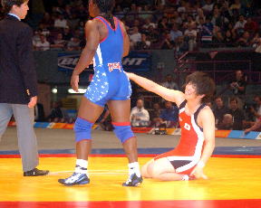 吉田沙保里(中京女大)はティナ・ジョージ(米国)を破って2連覇を決めると、昨年と同じくマットをバンとたたき、そこに顔をうずめた。「決勝は去年と同じ相手でしたが、先に1ポイントを取られ、去年より強くなったと感じました。よく研究してきていて、得意の正面タックルに入れませんでした」。