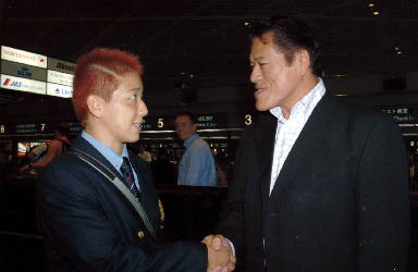 ton of Japanese media』と記されている。この『ton』は1トン、2トンの『ton』で、大きさや多さを強調するときに使う言葉)がニューヨークへ来る」と紹介された“世界のクイーン・オブ・レスラー”は、多くの人たちの期待にこたえてくれる成績を残してくれることだろう。(写真は渡米時の成田空港で、アントニオ猪木とばったり会ったところ)