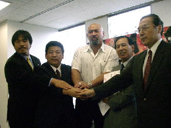 これは衆議院議員、同プロのレスラー、日本協会理事、専大監督などの顔を持つ馳浩氏(ロサンゼルス五輪代表)の発案で実行された。7月27日に地元の石川県で行なわれた全日本プロレス大会をアテネ五輪へ向けて協賛大会とし、全日本プロレス・レスラーのファイトマネーを低くしてもらい、地元有志もボランティアで大会運営に協力。8000人の観客によって集まった中から寄付された。贈呈式では、興行を担当した石川県スポーツ振興の会の森口邦光会長が現金で500万円を手渡した。(右写真は、左から馳氏、森口氏、武藤社長、福田会長、馳の大学時代の恩師の鈴木啓三・日本協会副会長)