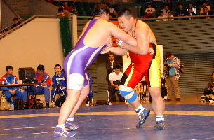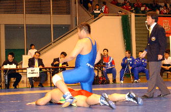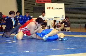 | ○…大会の最後を飾る一戦は、松本の強さとグレコローマンの醍醐味を十分に感じさせてくれた試合だった。「俵返しを出したかったけど、リフト技(バック投げ)だけで終わってしまった。最後はもう一発狙えるかなと思ったけど、気がついたらテクニカルフォールになっていた」と、一気の攻めのためポイント計算を間違ってしまったようだ。 昨年の全日本選手権は直前に左手を骨折して戦い、それでも優勝した。その回復に2か月もかかってしまい、いまも完治はしていないが(7〜8割程度の回復)、大きな影響はないので、立ち止まるわけにはいかない。ヨーロッパ選手権(5月23〜25日、ユーゴスラビア)を視察したあと、約2か月の予定でウクライナへ向い、現地選手との練習に臨む。「ヨーロッパ勢を倒さないと、メダルが見えてきませんからね」。見えているのは世界チャンピオンだけだ。 |
