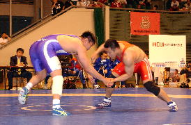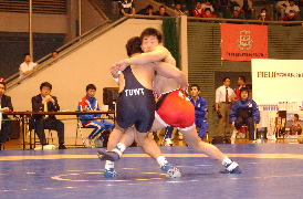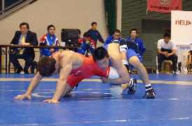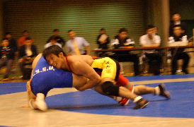 第2ピリオドは一進一退のまま、お互いにポイントにつなげられる呼応激がなかったが、ラスト30秒を切ったころに諏訪間がタックルで田中を押し倒し、3+1点を獲得。諏訪間が執念の逆転勝ちお演じた。(写真は青が諏訪間)