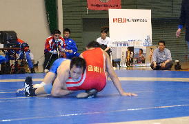 第2ピリオドは、菅がパッシブを取るが、パーテールポジションからの攻撃はノーポイント。逆に永田のがパッシブからのグラウンド攻撃でローリングを決め、4−0とした直後に終了のホイッスルが鳴った。永田は3年連続6度目の優勝。(写真は赤が永田)