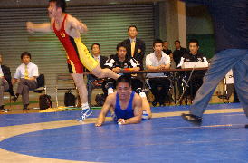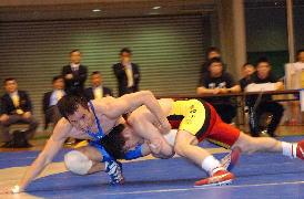 第2ピリオドは1分経過ころに安原がパッシブを取る。しかしローリングはあと一歩のところで決まらない。その後もスタンドの攻防で一進一退が続き、第2ピリオド終了。延長へ入ってのクリンチは、1度ずつ注意されタイミングが合わない。ようやくスタートしたあと、豊田がそり投げ気味に1回転して安原を転がし3点を獲得。4−0で勝った。豊田は2年ぶり3度目の優勝。(写真は赤が豊田)