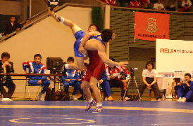 延長に入り、クリンチから田中がそり投げを仕掛けるタイミングで諏訪間がおおいかぶざり、値千金の3点を獲得。逆転勝ちした。諏訪間は初優勝。(写真は青が諏訪間)