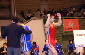そのままのスコアで延長へ入り、クリンチから再び静止状態が続き、太田が先に攻めたが組み手がはずれて1点を失ってしまった。ラスト1分15秒、関川が片足タックルで攻めるが惜しくも場外。逆に太田が片足タックルからテークダウンを奪い、3−1で振り切った。(写真は赤が井上)