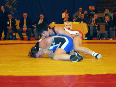 決勝でドイツ選手にフォール勝ちし、2大会連続優勝の伊調千春。