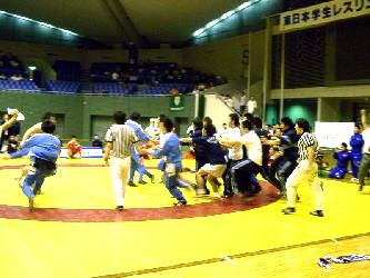 米山が勝った瞬間、日体大選手がマットへなだれこんだ。