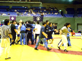 まだ勝者の手を上げる前。審判団も、日体大の怒とうのような