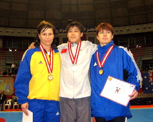 48kg級の決勝は、昨年の欧州選手権の決勝と同じ対戦となり、一昨年世界チャンピオンで負傷で戦列を離れていたブリジット・ワグナー(ドイツ)がリリア・カスカラコバ(ロシア)と延長の末、相手の投げの失敗によって3−0で勝ちました。3位決定戦では、マイェリス・カリパ(べネズエラ)が02年アジア大会2位のリディア・カラムチャコバ(タジギスタン)と4−4の協議判定の末、アテネ五輪へのキップを手にしました。(写真右は、左からカラコバ、ワグナー、カラムチャコバ)