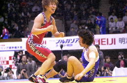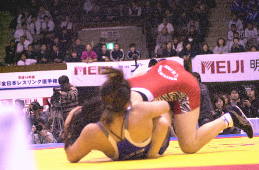 【評】伊調がパッシブを取り、パーテールからまささき攻撃で2+1点。さらにタックルを決めて4点目。第2ピリオドも早々にバックを取りグラウンドでも攻めて7−0、9−0とし、最後にまたさき攻撃。正田が返したが、すでに10ポイント差がついていた。伊調は初優勝。(写真:赤が伊調)