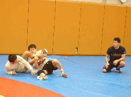 太田亮介にアンクルホールドを指導する和田コーチ。 |