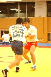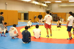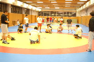 | グレコローマン(向こう側)とフリースタイルに分かれて練習。 |