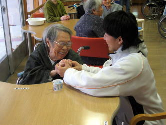浜口選手に励まされ、笑顔を見せる被災者