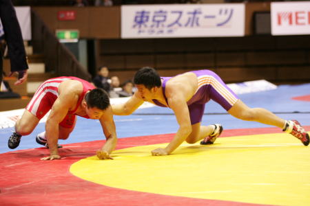アテネ五輪出場を逃したことで新日本プロレスを辞め、インターネットカフェで深夜のアルバイトをしながら母校(長野・北佐久農高)で練習している森角が、ここ数年来のライバルであり、壁になっていた加藤賢三を破って全日本王者に返り咲いた。