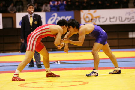 この試合までに、鈴木克彰(120kg級)、加藤賢三(96kg級)と昨年の全日本チャンピオンが負けたグレコローマンの試合。「自分もそうならないように気をつけたい」と、いっそうの気を引き締めて臨んだという飯室が実力を発揮し、5年連続優勝を達成した。