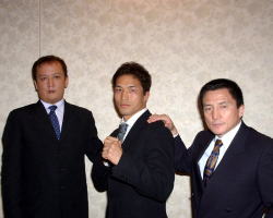 プロの総合格闘技入りを決めたシドニー五輪フリー63kg級代表の宮田和幸(クリナップ=プロのリングでの所属は「フリー」)が11月4日、都内で日大時代の恩師、富山英明監督とともに会見し、今月20日にハワイで行われるデビュー戦への意気込みを語った(写真右=左から谷川貞治K-1イベントプロデューサー、宮田、富山監督)。