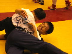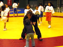“体育の日にオリンピアンとふれあおう”をテーマに、「平成16年度体育の日中央記念行事・子どもの体力向上キャンペーン」のイベントのひとつとしてレスリング教室も開催。日本協会事務局勤務の菅芳松さん(モントリオール五輪グレコローマン57kg級4位)が講師を務め、小林孝至さん(ソウル五輪フリースタイル48kg級金メダリスト)、井上謙二選手(自衛隊=アテネ五輪フリースタイル60kg級銅メダリスト)、山本美憂さん(世界選手権V3)、自衛隊体育学校のコーチ・選手らが指導。集まった約50名のチビッ子たちは、教わったばかりの正面タックル、けさ固め、ローリングなどを、コーチ相手に元気良くきめ、レスリングを楽しんだ。