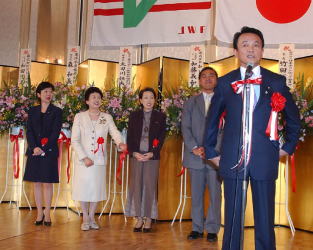 レスリングを支援していただいた国会議員の方々が登壇。 代表して麻生太郎総務大臣があいさつ。 (右から、麻生氏、馳浩氏、橋本聖子氏、小野清子氏、野田聖子氏)