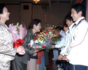 祝賀会で“ミス十日町”(!)から花束をもらう。