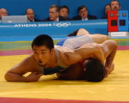 フレッシュなファイトが期待された小幡邦彦(綜合警備保障)は、1回戦で今年のアジア選手権2位のスジート・マン(インド)に8−0で快勝(写真右)。自らは3位に終わっていただけに(対戦はなし)、とりあえず上位の選手を破って気持ちよさそう。「(アテネは)熱かったので、食事を取りながらでも減量ができ、軽い感じで試合ができた。オリンピックは心地いい緊張感で、いいムードですね」と舌も滑らかだった。
