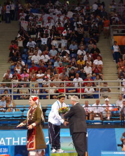 家族や多くの応援者に見守られてメダルを受け取る。
