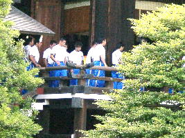 アテネ五輪の男子代表チームは8月6日、東京・国立スポーツ科学センターで行っていた国内最後の練習を打ち上げ、練習後、都内の靖国神社へ参拝した(写真右=規定で参拝の時の写真はありません)。靖国神社参拝は、富山英明強化委員長が金メダルを取った1984年ロサンゼルス五輪の前に実施。同五輪で「金2・銀5・銅2」を獲得したゲンのよさにあやかって、5大会ぶりに実施した。