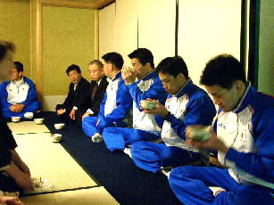 高田裕司専務理事(奥)らコーチ陣も一服。
