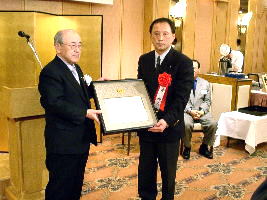 ヨネックススポーツ振興財団が優れたスポーツ指導者に贈るヨネックス財団賞に中京女大の栄和人監督を選出。16日、都内のホテルで授与式が行われ、表彰状と賞金100万円が贈られた。(写真右=左は同財団の米山稔理事長)