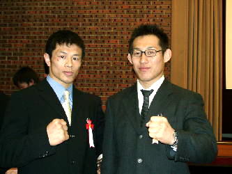 アテネ五輪代表にあと一歩と迫っている井上謙二(右=自衛隊、フリー60kg級)と あと二歩の菅太一(警視庁、グレコ74kg級)。 ゲストの前で代表権ゲットを宣言した。 (注:井上は全日本選抜選手権で優勝すれば代表へ。菅は優勝し、 さらに永田克彦とのプレーオフで勝って代表へ)