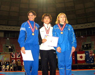 48kg級の決勝は、昨年の欧州選手権の決勝と同じ対戦となり、一昨年世界チャンピオンで負傷で戦列を離れていたブリジット・ワグナー(ドイツ)がリリア・カスカラコバ(ロシア)と延長の末、相手の投げの失敗によって3−0で勝ちました。3位決定戦では、マイェリス・カリパ(べネズエラ)が02年アジア大会2位のリディア・カラムチャコバ(タジギスタン)と4−4の協議判定の末、アテネ五輪へのキップを手にしました。(写真右は、左からカラコバ、ワグナー、カラムチャコバ)