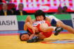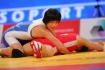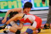 【3P】崩しが効いた坂本。相手の投げの失敗をうまくテークダウンにつなげ、1点を先制。するとこん身の力でローリングを3回転。7−0としてテクニカルフォール勝ち。銅メダルを引き寄せた。