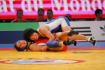 【2P】坂本はしっかりがぶり、逃げられそうになったあとは両足タックルへ切り替えてテークダウンを奪う。アンクルホールド2回転で2点を追加するなどし、1分の段階で5−0。その後も1点を加え、6−0としてテクニカルフォール勝ち。