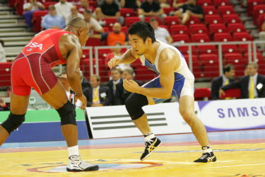 74kg級の小幡邦彦選手は、アテネ五輪5位のウイリアムズ(米国)相手(写真右)に開始直後に片足タックルを受けて1点を失いました。スピードあるタックルだったので、失点してしまったのは仕方なく、これを1点で押さえたことは上出来かもしれません。