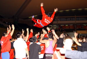 決勝戦で痛恨の1敗を喫したとはいえ、主将としての責任を立派に果たした4か月間。高松義行部長、松原正之総監督、富山英明監督と続いた胴上げで、監督直々に指名されて宙を舞ったのは(写真左)、当然のことだった。「胴上げを受けたのは初めて。気持ちよかったですね」という言葉が出た時、初めて会心の笑みが浮かんだ。