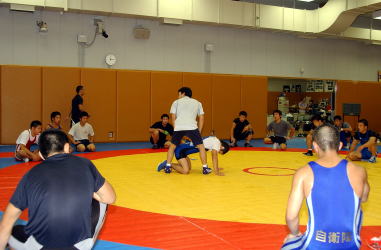 グレコローマンの俵返しの指導をする嘉戸洋コーチ。