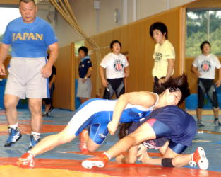 アニマル浜口特別コーチも参加。選手に気合を注入する。