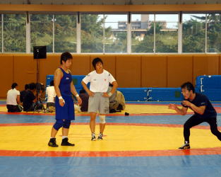 練習で納得のできない点があった浜口京子(72kg級)は、金浜良コーチ、